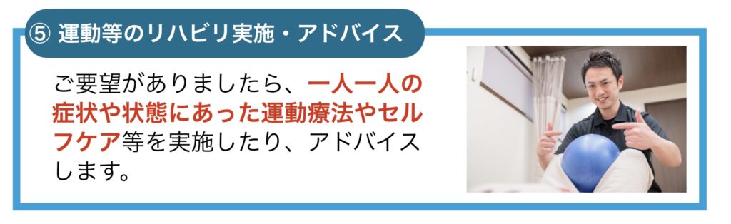 それだけはなく、身体のケアはもちろん、色々な相談にも乗ってくれ、心のケアもしてもらっています。先生には、1人でこもりきりになりがちな気持ちも、何でも話せて、支えてもらっています。